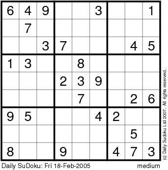 The Daily SuDoku: Fri 18-Feb-2005