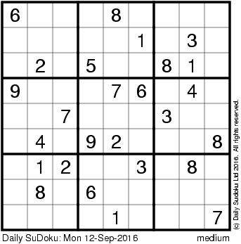 The Daily SuDoku: Mon 12-Sep-2016