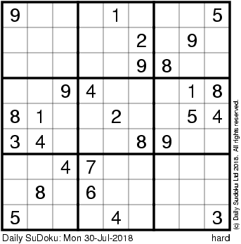 The Daily SuDoku: Mon 30-Jul-2018