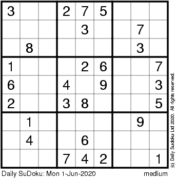 The Daily SuDoku: Mon 1-Jun-2020