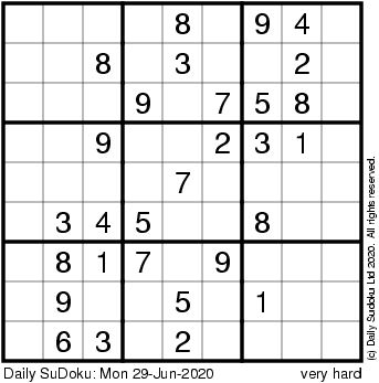 The Daily SuDoku: Mon 29-Jun-2020