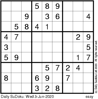 The Daily SuDoku: Wed 3-Jun-2020