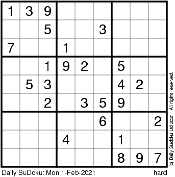 The Daily SuDoku: Mon 1-Feb-2021
