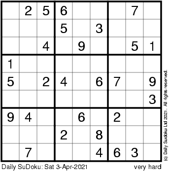 The Daily SuDoku: Sat 3-Apr-2021