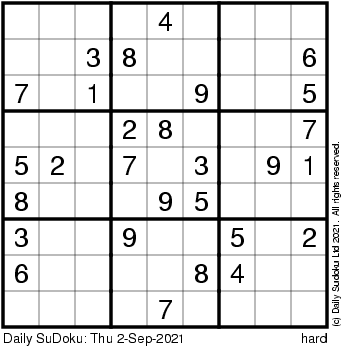 The Daily SuDoku: Thu 2-Sep-2021