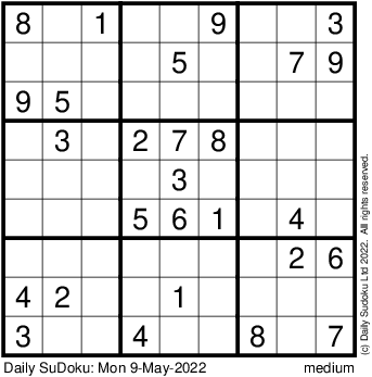 The Daily SuDoku: Mon 9-May-2022