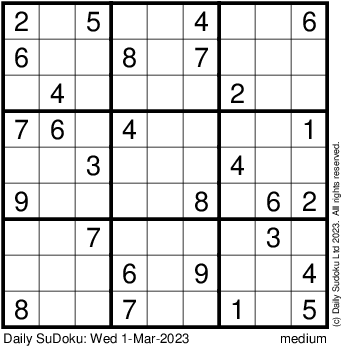 The Daily SuDoku: Wed 1-Mar-2023