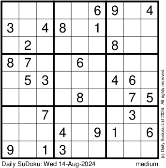 The Daily SuDoku: Wed 14-Aug-2024