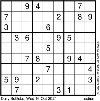 The Daily SuDoku: Wed 16-Oct-2024